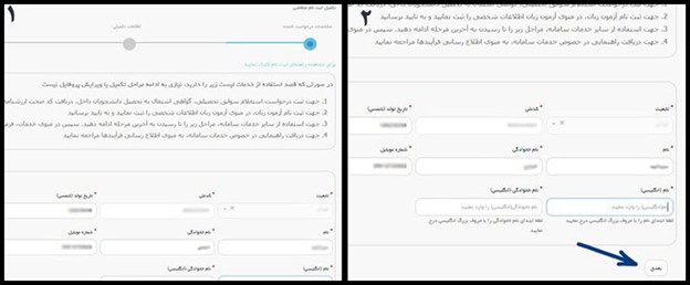 در مرحله بعد اطلاعات مربوط به نام پدر،شماره و سریال شناسنامه، وضعیت تاهل، وضعیت شاهد و ایثارگری و وضعیت نظام وظیفه را نوشته و تصویر کارت ملی، عکس شناسنامه و عکس پرسنلی خود را که قبلا اسکن آنها را تهیه کرده ایند آپلود کنید. فایل آپلود شده باید به صورت PDF باشد.
