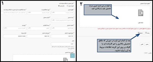نکته ای که باید حتما به آن توجه کنید این است که ابتدا پایین ترین مقطع تحصیلی و بعد از بارگذاری تصویر مدرک تحصیلی، بر روی گزینه اضافه کلیک کرده و در صورت داشتن مدرک تحصیلی مقاطع بالاتر، آن را وارد کنید. به طور مثال اگر در ۲ مقطع کاردانی و کارشناسی مدرک تحصیلی دارید اول اطلاعات مربوط به مدرک کاردانی را وارد کرده و بعد از کلیک روی گزینه اضافه (که در تصویر نشان داده شده است) مقطع تحصیلی کارشناسی را وارد و به همین ترتیب در صورت داشتن مدارک بالاتر همین روند را ادامه دهید.