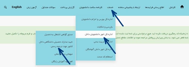 مرحله بعد مرحله درخواست تایید تحصیلی سجاد برای مدارک شماست. به بخش “خدمات”، “اداره کل امور دانشجویان داخل” و سپس “تایید مدارک تحصیلی داخل کشور جهت ترجمه رسمی” بروید.