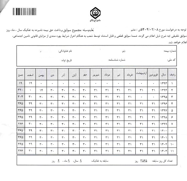 سوابق تلفیقی که مجموع سابقه را بدون نام کارگاه و به تفکیک روز و ماه و سال نشان می دهد. نمونه این نوع سابقه در ادامه نمایش داده شده است: